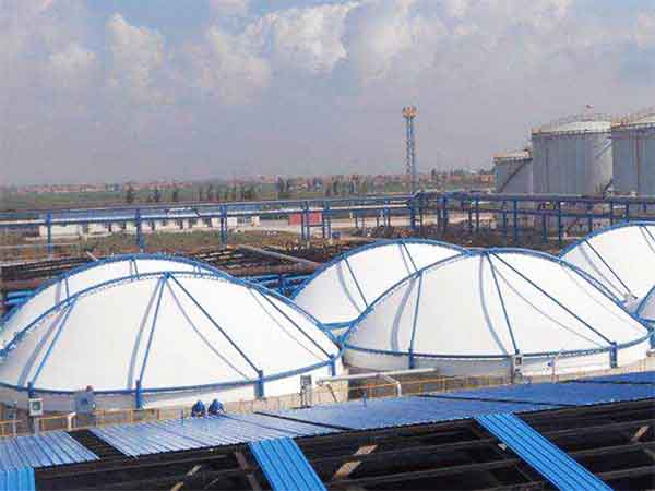 2、由于所有鋼支撐反吊膜結構均為密封體且膜結構造型為光滑曲面(負高斯曲面),風(fēng)荷載體型系數小,抗風(fēng)等級高,可按照抵抗12級臺風(fēng)設計;膜自身防腐性能好,自重輕,對大跨度池體最具優(yōu)勢,造型多樣,美觀(guān)新穎;3、安裝快捷:鋼結構制作和膜體的加工都在工廠(chǎng)進(jìn)行,加工質(zhì)量得到可靠保障?,F場(chǎng)安裝時(shí)間短,減少了對場(chǎng)地的占用。尤其是舊池體改造項目可采取結構整體吊裝,不影響池體內部的設備運轉;4、檢修方便:由于工藝上的要求,需要定期對設備維修和檢查,可以通過(guò)在邊膜上預留門(mén)(膜結構密封垂簾門(mén)或塑鋼窗)和通道的方式解決。5、密封性能好:所有膜材采用熱熔焊接,現場(chǎng)安裝的膜材片之間采用現場(chǎng)熱熔焊接的“二次節點(diǎn)密封”既保證罩體的密封,又能保證隔絕內部腐蝕氣體對鋼結構的腐蝕。6、便于與現場(chǎng)設備管道密封連接:所有立面的膜結構均可按需要現場(chǎng)開(kāi)洞,現場(chǎng)熱熔焊接恢復氣密性。三、美觀(guān)性