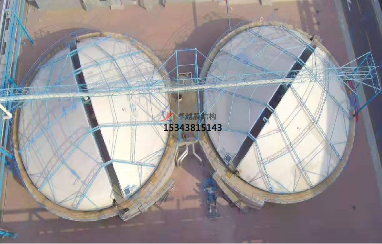 雙膜密封罩結構是污水池上加蓋的一個(gè)氣囊,它由上下兩層氟碳纖維膜焊接而成,通過(guò)周邊與污水池池壁錨固,形成一個(gè)穩定的受力結構,起到污水池內惡臭氣體密閉的效果。雙膜密封罩結構的優(yōu)點(diǎn)是結構牢固、密封性好、防止水溫升高或降低,適用于工業(yè)水曝氣池或市政污水池。