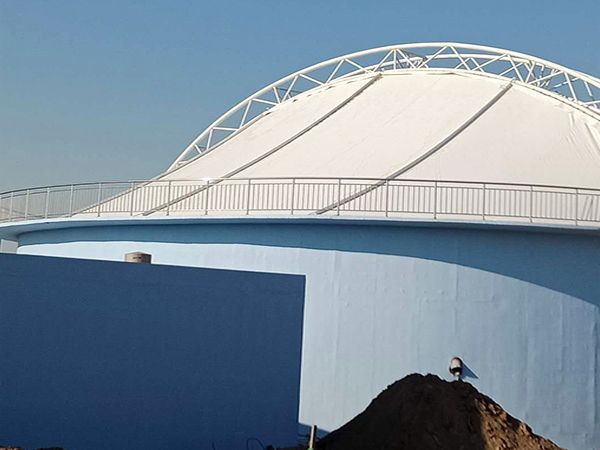 吐魯番卓越膜結構工程公司是集污水池加蓋反吊膜加蓋工程設計施工、結構設計、靜動(dòng)力計算分析、整體結構安裝以及使用維護于一體的綜合性工程公司。污水池反吊膜結構中的高強度柔韌薄膜稱(chēng)膜材,它是一種耐腐蝕、耐高溫、耐久用、高強度的樹(shù)脂類(lèi)涂層織物,由多種復合PVC樹(shù)脂涂層刀刮成型,具有質(zhì)地柔韌、厚度小、重量輕、透光性好的特點(diǎn)。對自然光吸收和透射能力、阻燃,具有良好的耐久、防火、氣密等特性;表面經(jīng)過(guò)特氟龍處理或二氧化鈦抗老化處理,具有較高的自清潔性能。下面就大家介紹一下我公司在吐魯番地區完成的部分污水池膜結構封閉項目。