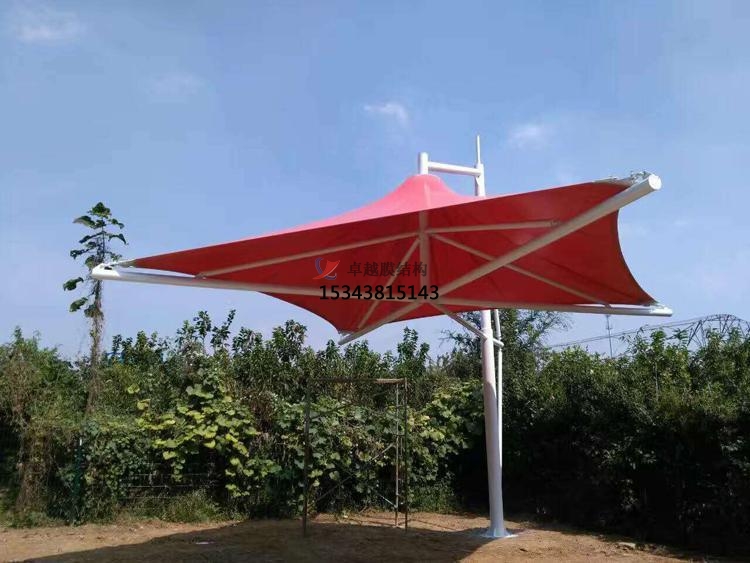 縱所周知,景觀(guān)膜結構遮陽(yáng)棚所用的膜材料為具有高強、阻燃、耐久、自潔等特性的高強復合材料,一般由基布和涂層二部分組成?;贾饕捎酶邚娋壑w維或玻璃纖維絲編織而成,有平織和絞織等多種編織方法,不同的編織方法影響著(zhù)膜材料的經(jīng)緯向力學(xué)性能指標,提供膜的抗拉強度和抗撕裂強度等;涂層材料主要有聚四氟乙烯和聚氯乙烯,在一定程度上提高了膜材料各項強度指標,為提高膜材料的耐久、自潔等特性,表面往往有一層氟涂層或硅涂層,提供膜材料的耐火、耐久及防水、自潔等性能,決定著(zhù)膜材料的物理特性。