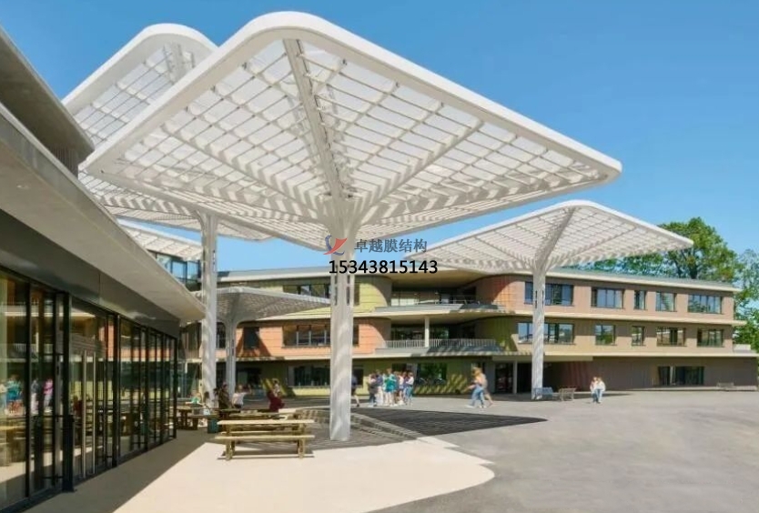 膜結構景觀(guān)可以采用多種形狀和顏色的膜材料,通過(guò)張力和支撐系統來(lái)實(shí)現懸掛和張拉的效果,其設計靈感來(lái)自于自然界中的形態(tài)和結構,如植物葉片、動(dòng)物骨骼等,常見(jiàn)的應用包括遮陽(yáng)棚、入口門(mén)廊、地標建筑等等。