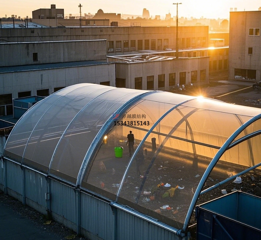 在工業(yè)垃圾處理站,膜結構罩棚也發(fā)揮著(zhù)重要作用。某大型工業(yè)園區的工業(yè)垃圾處理站,選用骨架式膜結構罩棚,根據不同類(lèi)型工業(yè)垃圾的處理需求,對罩棚內部進(jìn)行分區規劃,實(shí)現了工業(yè)垃圾的分類(lèi)存放與高效處理。