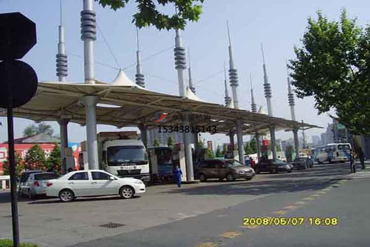 如今隨著(zhù)建筑技術(shù),計算機技術(shù)和新材料研究的飛速發(fā)展,性能優(yōu)良的新型膜材被用于建造永久性的加油站罩棚結構,即膜結構加油站罩棚,這種結構的加油站罩棚一般由索和膜材這些柔性材料張拉而成。