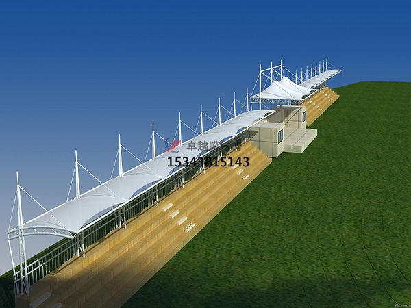 索膜結構看臺的施工流程:其施工流程包含基礎施工、鋼構預拼裝、膜材裁剪、現場(chǎng)安裝、調試與驗收?;A施工是根據設計要求進(jìn)行基礎的開(kāi)挖、澆筑等工作,確?;A的承載能力滿(mǎn)足索膜結構看臺的受力需求。鋼構預拼裝是在工廠(chǎng)或施工現場(chǎng)對鋼結構構件進(jìn)行預拼裝,檢查構件的尺寸、形狀和連接情況,確保安裝精度。膜材裁剪是根據裁剪設計方案,對膜材進(jìn)行精確裁剪,裁剪過(guò)程中要注意膜材的經(jīng)緯方向和尺寸精度?,F場(chǎng)安裝是先安裝支承結構和鋼索,然后將裁剪好的膜材吊運至現場(chǎng),按照設計要求進(jìn)行張拉和固定,張拉過(guò)程中要實(shí)施分級加載,同步監測應變值。最后是調試與驗收,是對索膜結構看臺進(jìn)行整體調試,檢查膜面的平整度、張力分布等情況,確保符合設計要求,最后進(jìn)行驗收。