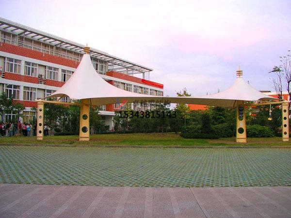 商業(yè)廣場(chǎng)雨棚搭建以其輕盈飄逸的造型、柔美并帶有力量的曲線(xiàn)和大跨度和大空間的鮮明個(gè)性和標識性,并與園林景觀(guān)溶為一體。創(chuàng )造出讓人們盡情享受的快樂(lè )空間。充分展示了結構構件清晰受力的藝術(shù)之美,它巧妙的整合周?chē)沫h(huán)境,給人們一種高貴典雅、浪漫溫馨之感。另外由于張拉膜材料本身特有的顯色性,在夜間彩燈的映射下能形成絢麗繽紛的景觀(guān)。不僅為人們提供遮陽(yáng)避雨的空間。同時(shí),更由于這種生動(dòng)活潑的造型能給人們帶來(lái)時(shí)尚、輕松的休閑感受,所以廣受歡迎。