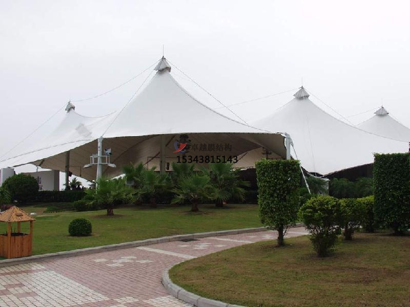 1.骨架式張拉膜景觀(guān):以鋼構或是集成材構成的屋頂骨架。下部支撐結構安寧性高,因屋頂造型比擬單純,開(kāi)口部不易受限制,且經(jīng)濟效益高等特點(diǎn),廣泛適用于任何大,小規模的空間。利用鋼索與支柱在膜材中導入張力以達安定的形式。除了可實(shí)踐具創(chuàng )意,創(chuàng )新且美觀(guān)的造型。