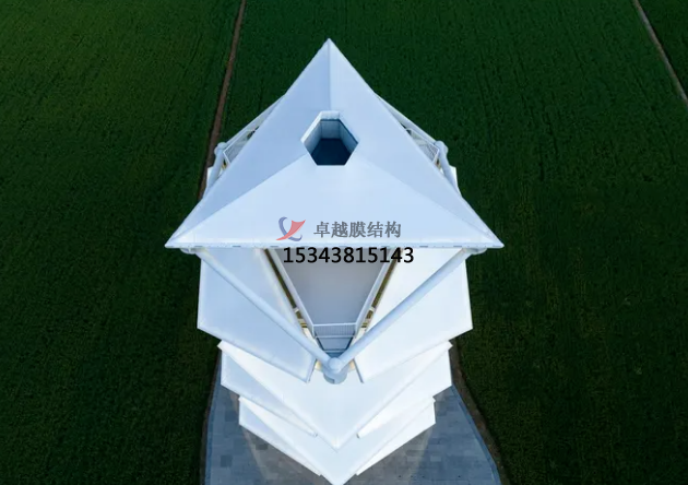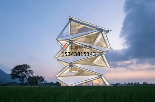 建筑的表面為白色的高強度薄膜結構,每層交錯布置,在登塔的漫游路徑中通過(guò)框景的變化展現出移步異景的視覺(jué)感受。項目面向所有人開(kāi)放,乘坐輪椅的訪(fǎng)客也可以通過(guò)底層中心的核心筒電梯直達頂層。從頂層的觀(guān)景臺,人們可以獲得360度的視野,視線(xiàn)可以延伸到遠處的村莊和城市。