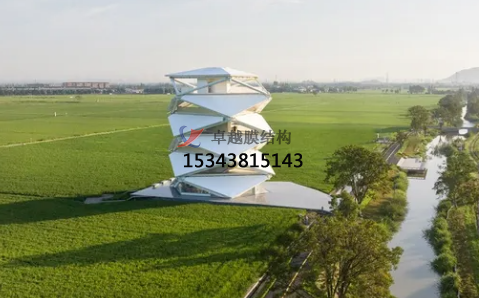 稻田上的燈塔的落成為當地的鄉村提供了新的觀(guān)景點(diǎn)和社交聚集地。瞭望塔塔高23m,坐落于國家級現代農業(yè)先行示范區高標準農田的中心區域。它如同雕塑一般從稻田中螺旋升起,三角形元素和白色PTFE薄膜定義了其簡(jiǎn)潔的設計語(yǔ)言,在鄉村大地上賦予了其強烈的存在感。