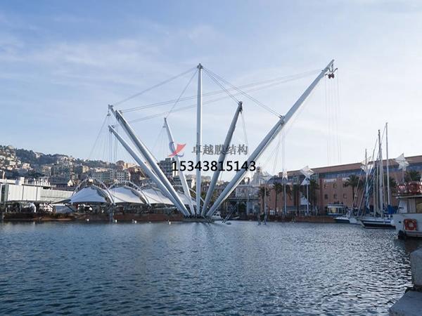 2、 混凝土結構主體加鋼拱:以上兩種更簡(jiǎn)單的膜結構,依平面的形狀,如方形、菱形等,可有許多變化,拱的間距依使用的膜材強度、設計荷載、風(fēng)力等確定。