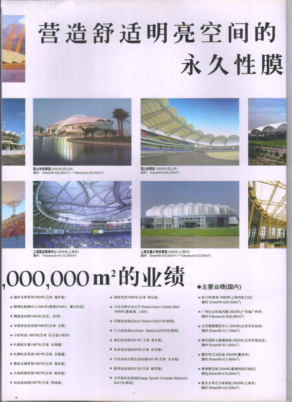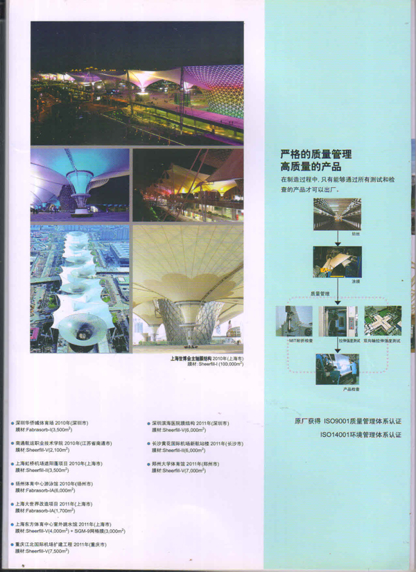 圣戈班工業(yè)薄膜為市場(chǎng)提供高性能聚合物薄膜、微孔過(guò)濾膜、薄膜圖層、復合薄膜和壓敏膠帶等多種產(chǎn)品近40多年,在相關(guān)行業(yè)中具有領(lǐng)先的地位。在諸多建筑中,我們都能看到圣戈班的影子,其中就有被很好的建筑師青睞的PTFE的建筑膜,實(shí)際上它就是圣戈班SHEERFILL®建筑網(wǎng)格布。