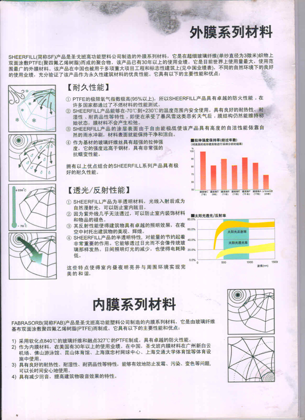 SHEERFILL產(chǎn)品能夠在-70C到+230C的溫度范團內安全使用。具有良好的耐熱性、耐濕性、耐藥品性等特性,即使在承受了暴風(fēng)雪這類(lèi)惡劣天氣后,膜結構仍然能維持初始狀態(tài),膜材料不會(huì )產(chǎn)生松弛。